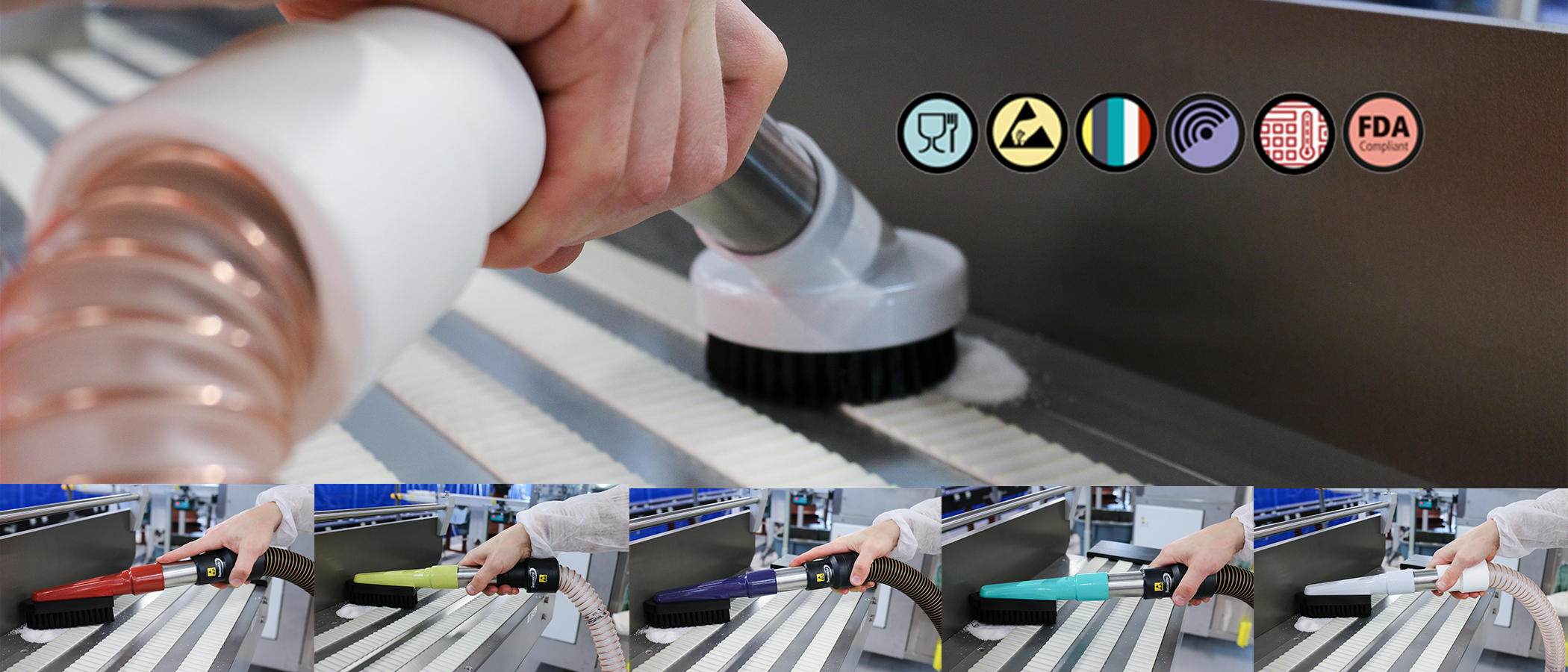 Wenn es mehr als sauber sein muss Den Arbeitsplatz staubfrei zu halten, ist nicht nur eine Frage der Arbeitsumwelt und Gesundheit. Es ist auch ein betriebliches Thema. Je sauberer die Arbeitsumgebung ist, desto besser wird das Endergebnis. Wir nennen das Healthy Business. Dustcontrol entwickelt und installiert komplette Punktabsaugungssysteme in enger Zusammenarbeit mit dem Kunden. Unsere Punktabsaugungssysteme können zur optimalen Wiederaufbereitung vollständig in den Produktionsprozess integriert oder als zentrales Staubsaugersystem eingesetzt werden. Unsere Saugbürsten haben ganz spezielle Eigenschaften. Entsprechend den Anforderungen unserer Kunden sind die Bürsten farblich codiert. Sie bestehen aus antistatischem (ESD) Material, können hygienisch gereinigt werden (im Autoklav) und sind automatisch erkennbar. Mit anderen Worten: Sie sind für Lebensmittel geeignet. Wir haben neben unseren Bürsten ein komplettes Sortiment an Reinigungszubehör und Schläuchen speziell für die Lebensmittelindustrie.